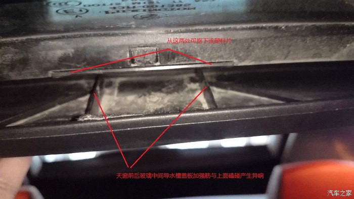 相信很多車友都知道,4S店一般都是“和稀泥”不愿意解決這種問題。實際就是前后玻璃導水槽與下面蓋板中間的兩條小加強筋磕碰產生的響聲。